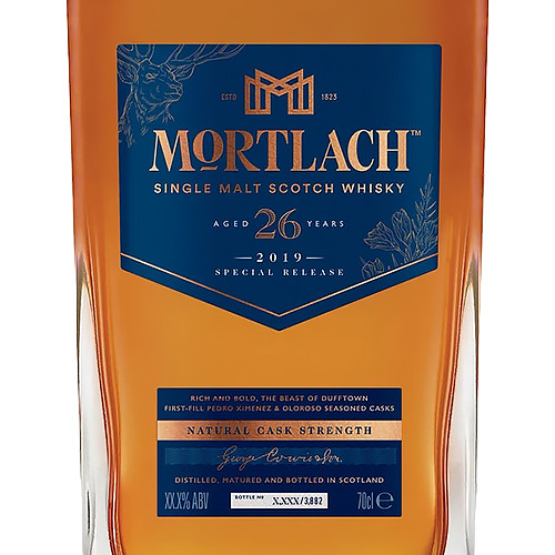 Mortlach 25 Year Old Single Malt Scotch Whisky is the oldest expression in Mortlach’s newest range of single malts. Presented in a bottle designed by Laurent Hainaut, the whisky has a deep, golden amber color. A woody, highly fragranced nose is balanced by tropical aromas, particularly mangos, pineapples and peaches. The palate develops with white chocolate, ginger and a light smoke, and leads to a sweet finish with more ginger and some cinnamon spice.